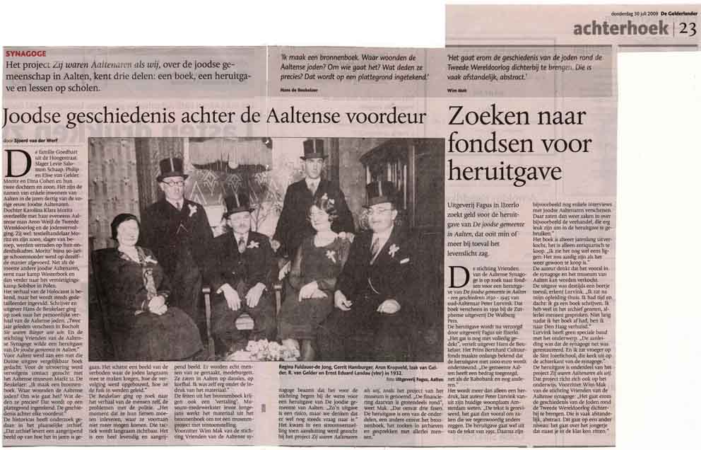 Hans de Beukelaer schrijft in opdracht van de Vrienden van de Aaltense Synagoge op basis van literatuur- en archiefonderzoek in politie- en gemeentearchieven een bronnenboek, waarbij hij een beeld schets van de Joodse Aaltenaren in de jaren dertig en veertig, met als onthullende conclusie dat in Aalten naar verhouding veel meer Aaltense Joden de Holocaust overleefden dan in de rest van de provincie Gelderland.
